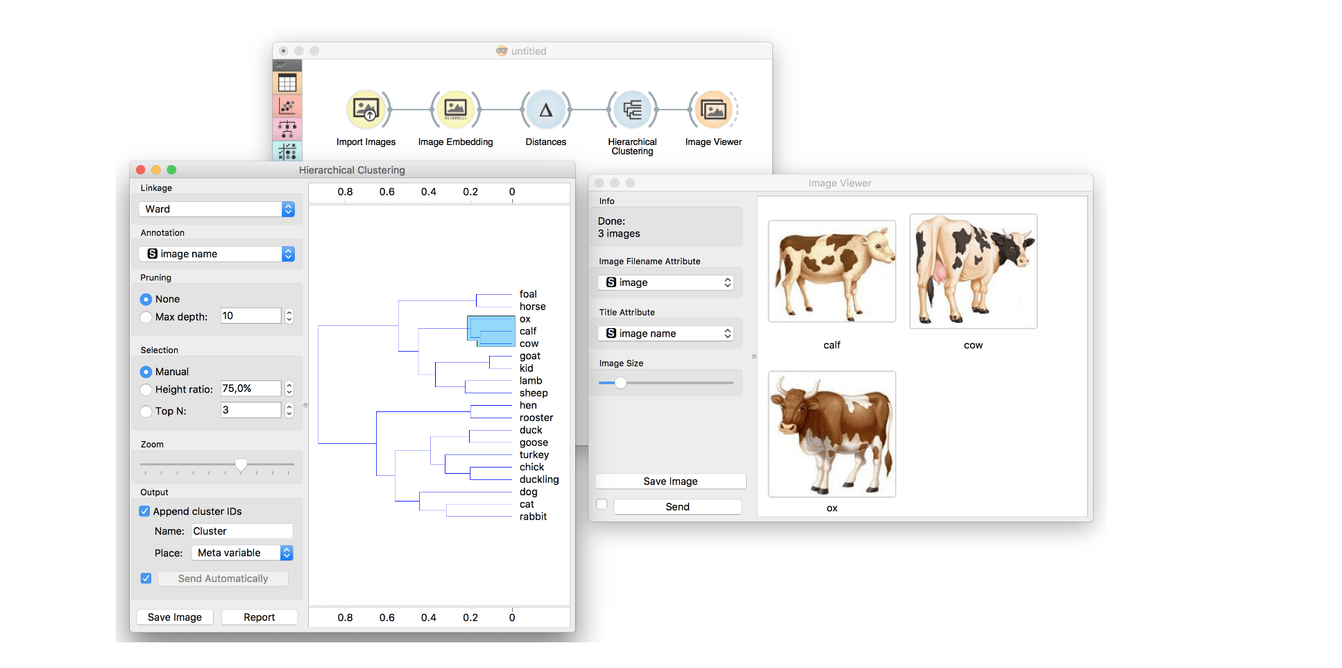 Our hands-on lesson required compiling 30-50 images that have similar themes or visual elements. I uploaded the images to a program called Orange. Orange uses machine learning to group images based on similar visual clues. The example image shown below shows how different animals were grouped based on things like color, size, shape, and pattern that the computer can recognize from being shown thousands of training images from different sources (such as Google images, archives, facial recognition sites).