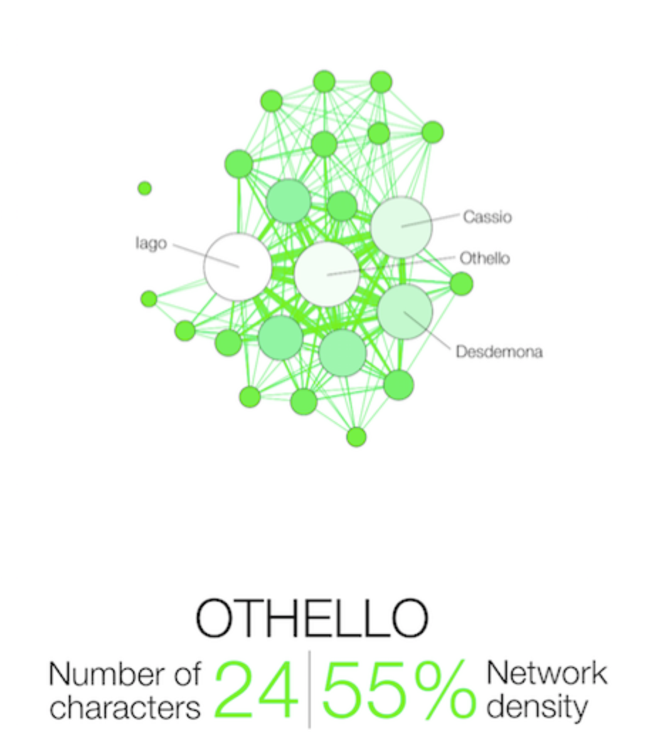 Day 4 began with network analysis which our group facilitator defined as “graphs as representations of relations between discrete objects.” A typical network graph consists of Nodes (representing all separate entities) and edges (the defined relationship that connects entities to one another). As a class, we examined two different network data sets pertaining to character interactions in literature/television. The first was a fully formed network data set by Martin Grand Jean that abstracted character interactions in Shakespeare’s Tragedies. It is essential that in a network data set, the creator must clearly define the connecting pieces. It can be when two characters talk directly, when both are on stage simultaneously or when one is talking about the other. Some uses of Network analysis include determining centrality- are they the central characters? How is their presence structured? It also can be used as a tool to examine gender and race inequality in stories- how central are women and POCs in a narrative? Do they interact with one another or are they used to further the plot of leads?