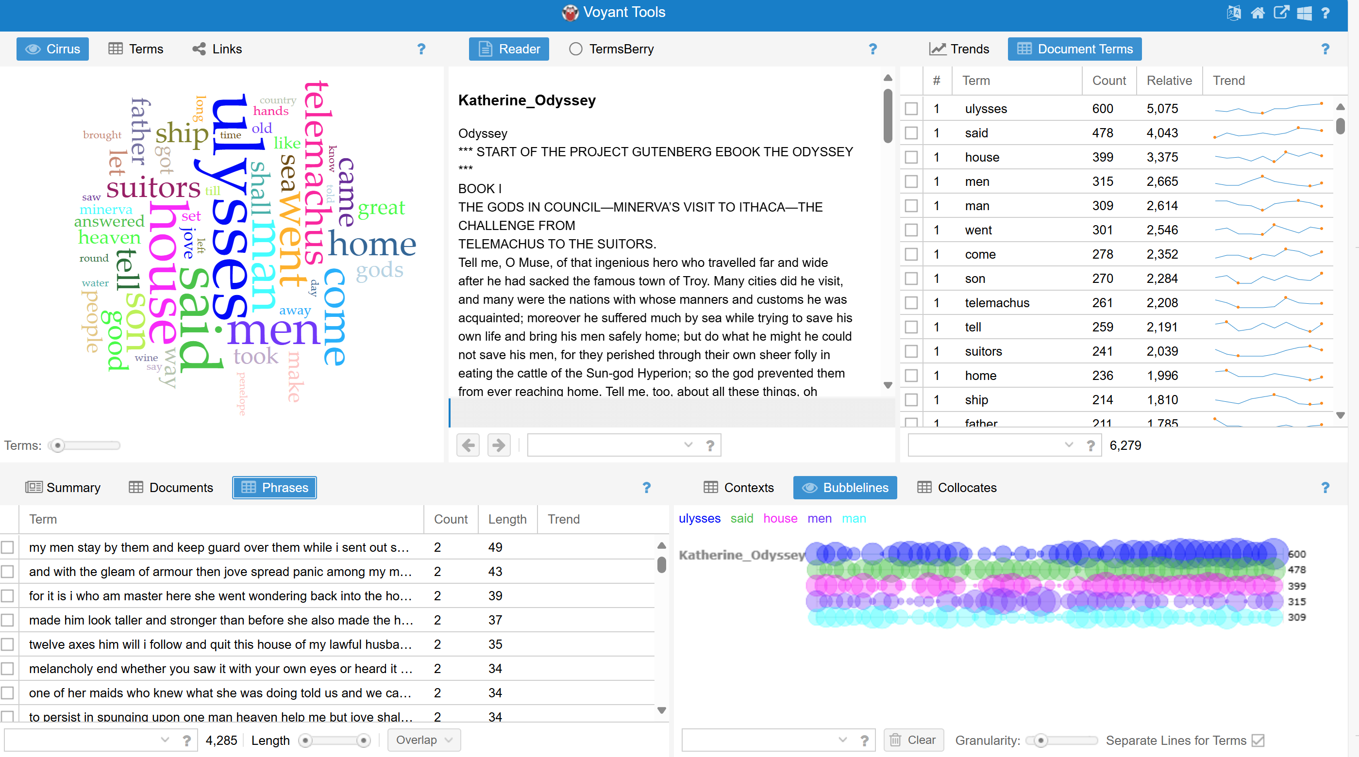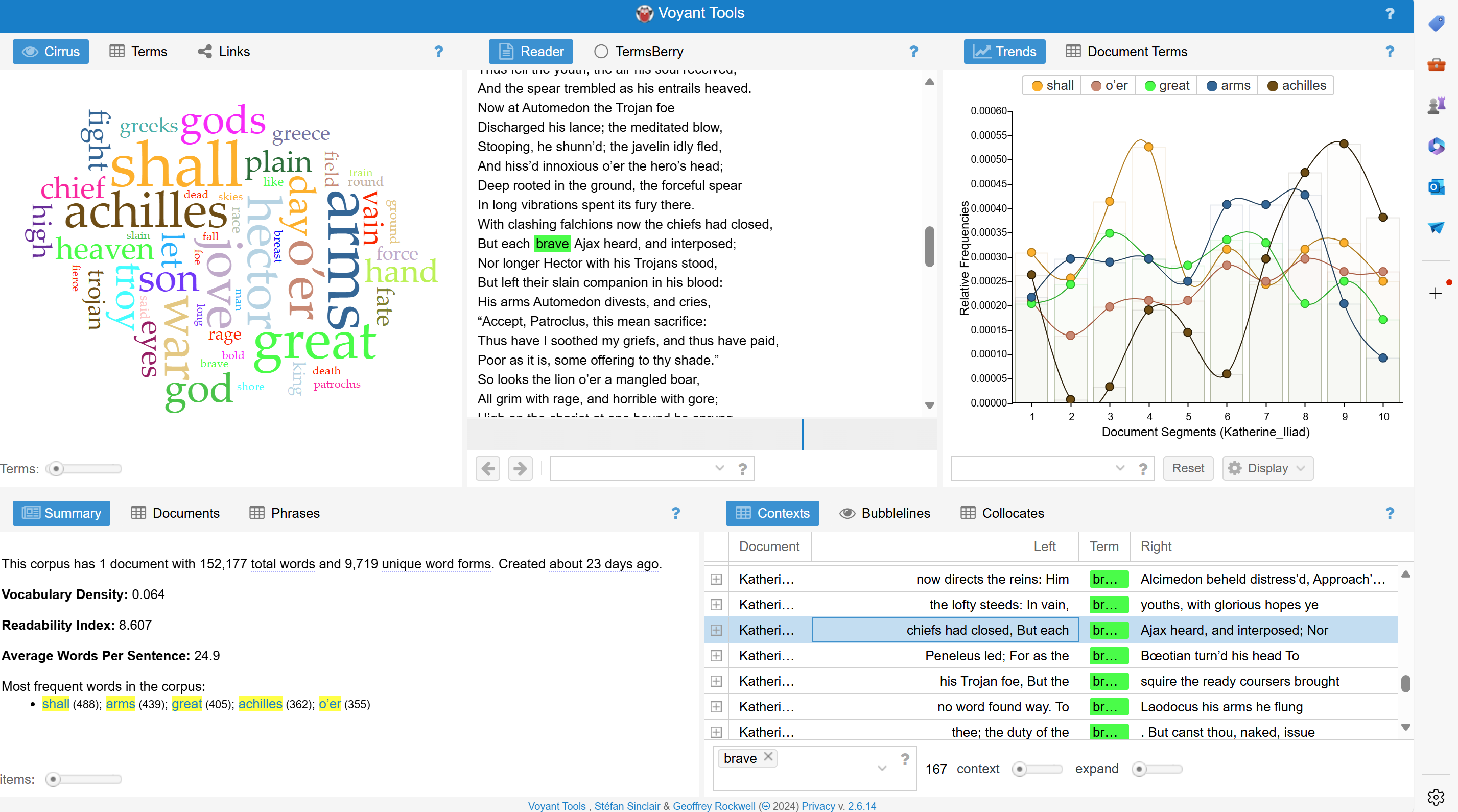 The second half of day one was spent learning the basics of textual analysis. We used the free website Project Gutenberg to select a piece of text to analyze using the Voyant Tools program. In order for many text analysis programs to work, the text chosen must be in its most bare-bones digital state; a txt. file (meaning it is all text and no filler). Voyant Tools works by taking the text in a txt. file and tokenizing it, meaning it splits text into parts typically with words as tokens. They must decide what classifies a token. For example, are contractions one or two words? Then the program itemizes the text by frequency of words. Another option for customization in textual analysis comes with the use of stopwords. Stopwords are words/tokens excluded from the count. Voyant Tools automatically takes out the most common stopwords such as the, a, and, he, to highlight the more thematic words used. However, this feature is flexible and open to play around with. I used The Aeneid, The Odyssey, and The Iliad for my textual analysis as they were all available as free txt. files and I have read all three so I was able to interpret their textual features with some prior knowledge of the text. Voyant Tools has many features but I looked at a textual word cloud, frequency table, and an interesting feature that documents the most common phrases to the left and right of a chosen word. I found this super helpful when looking at the epithet terms in epic poetry. I was able to see how often the word Rage appears near or next to Achilles. Overall Voyant Tools is super easy to navigate and something I will certainly use in the future. It is both excellent for the exploration of a text and also a great launching pad for questions about authorial intent or thematic word choices.